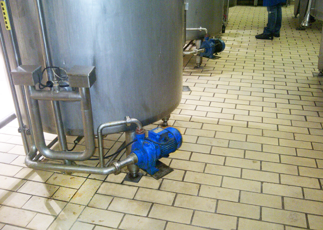 Các máy bơm ly tâm cánh đơn bằng gang họng kết nối ren EBARA CM và bơm lốc xoáy bằng gang EBARA PRA bơm nước nóng ở 45 ° C vào sâu trong các bể lớn chứa socola.