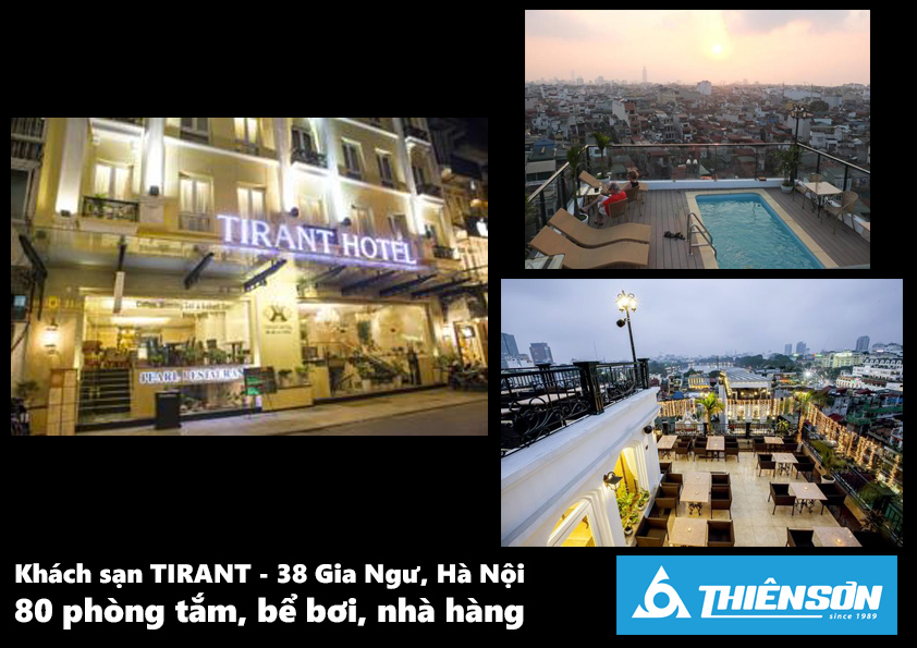 Tư vấn, lắp đặt hoàn thiện hệ thống máy bơm nước Khách sạn Tirant gồm 80 phòng nghỉ tương ứng 80 phòng tắm, bể bơi, nhà hàng cùng nhiều công trình vệ sinh khác trong khách sạn bao gồm: